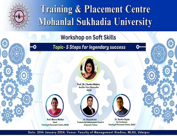 The Training & Placement Centre aims to provide placements and corporate interface for the students of Mohanlal Sukhadia University. The objective of the centre is to make the students aware about the job opportunities and help them prepare for interviews and selection processes. Since its inception, the Training & Placement Centre has been successfully able to place students of different courses & has invited reputed MNCs from Information Technology, Banking & Finance, Law , Manufacturing, Media, Services, Social Sector, etc. The competition for jobs is becoming more and more intense every day, and finding a job has become a tough proposition. The institution's role in providing necessary training to the students and also providing them with life skills has grown significantly. It is also vital to create a comprehensive personality in addition to technical skills in every student.